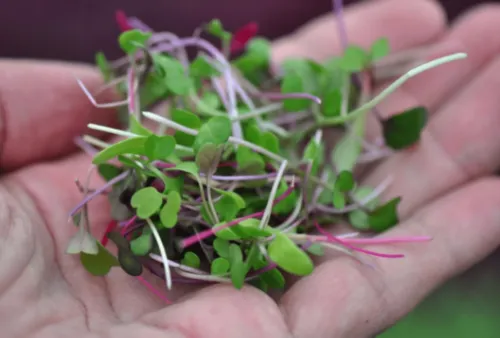 Microgreens are green vegetables harvested right after they develop cotyledons (first leaves that form when the seeds start to sprout), but before they develop true leaves. Like the name suggests they are tiny (micro-size) vegetables and are grown and harvested within 10 – 3 weeks depending on the variety. Where sprouts have some risks associated with them due to their humid growing environment, microgreens are completely safe to eat.