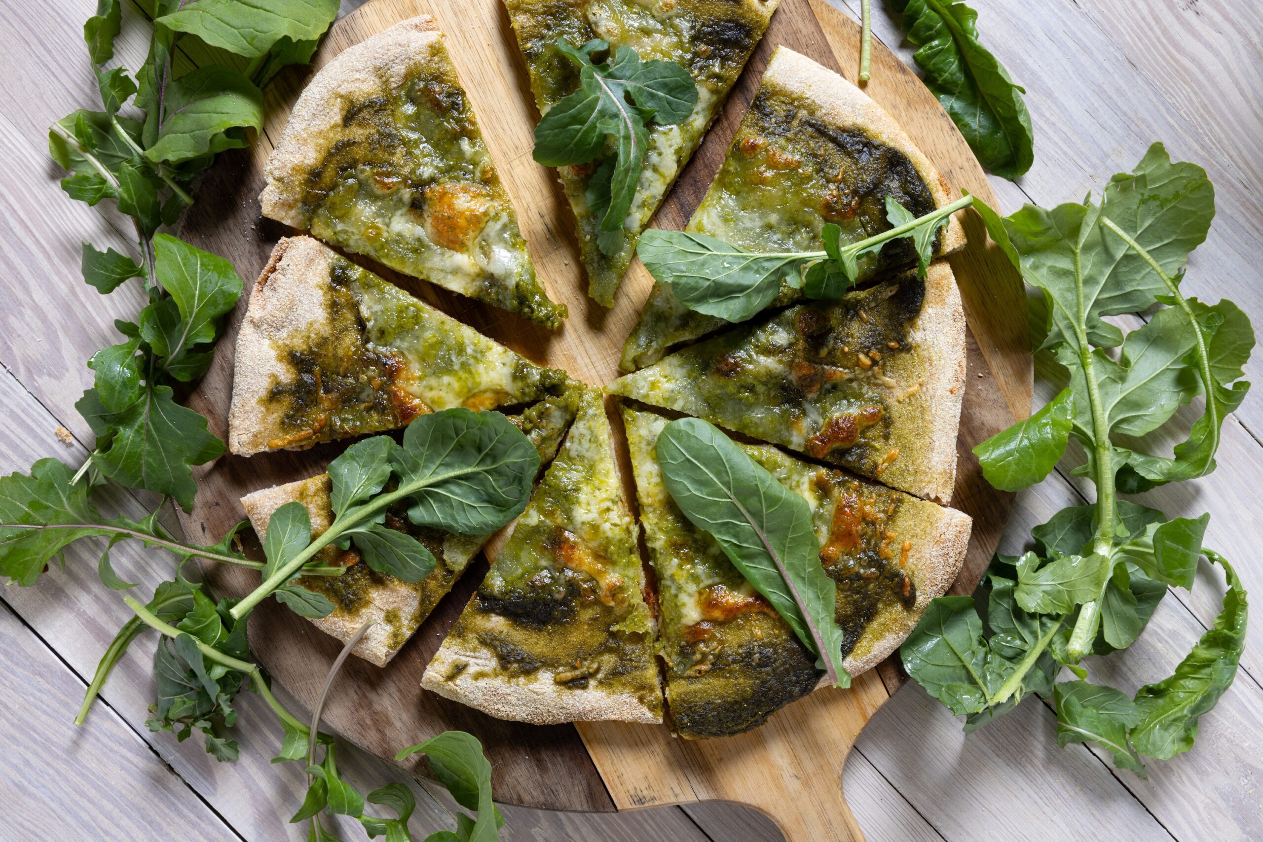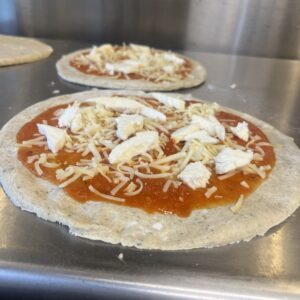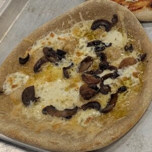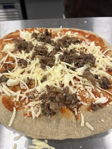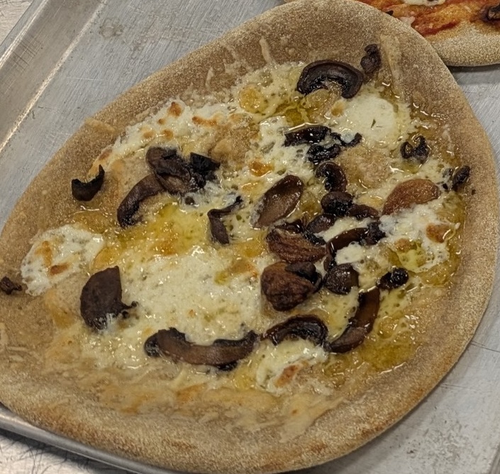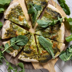 Sourdough crust pizza topped with a creamy garlic white sauce made from heavy cream, roasted garlic, and Parmesan cheese. Then topped with our microgreen drizzle made from broccoli microgreens right from our farm.