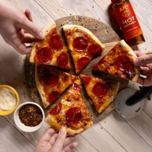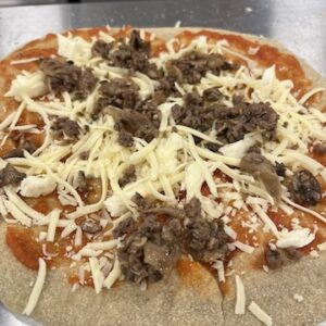 Ingredients: Sourdough crust (flour, water, salt), house red sauce (tomatoes, onions, garlic, olive oil, vegetables, herbs), mozzarella and cheddar cheese blend.